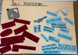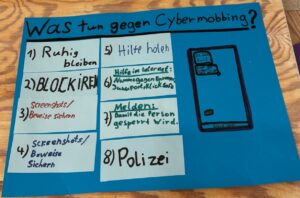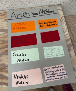 Zu jedem behandelten Themenschwerpunkt gestalteten die Schüler*innen kurze Informationseinheiten, die sie in anschaulichen Informationsplakaten zusammenfassten. Darüber hinaus beschäftigten sie sich mit ihren eigenen Stärken und machten sich gegenseitig wertschätzende Komplimente.